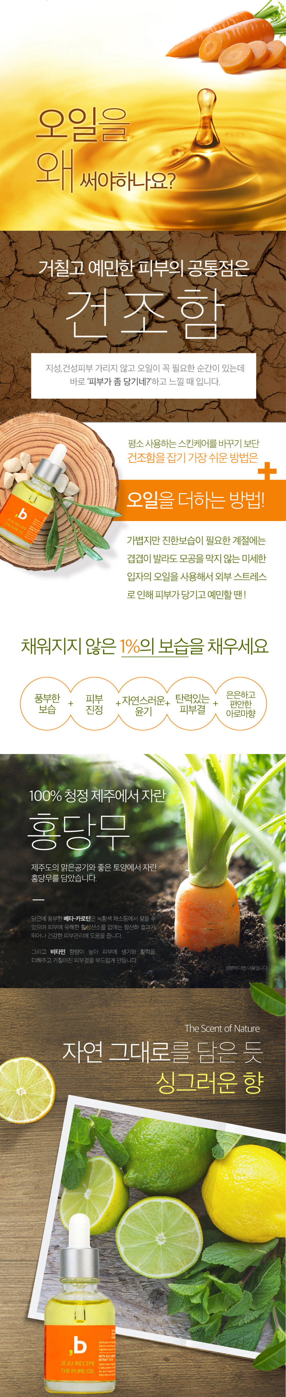 청정 제주 당근과 자연유래 식물 오일을 담은 보습 오일.